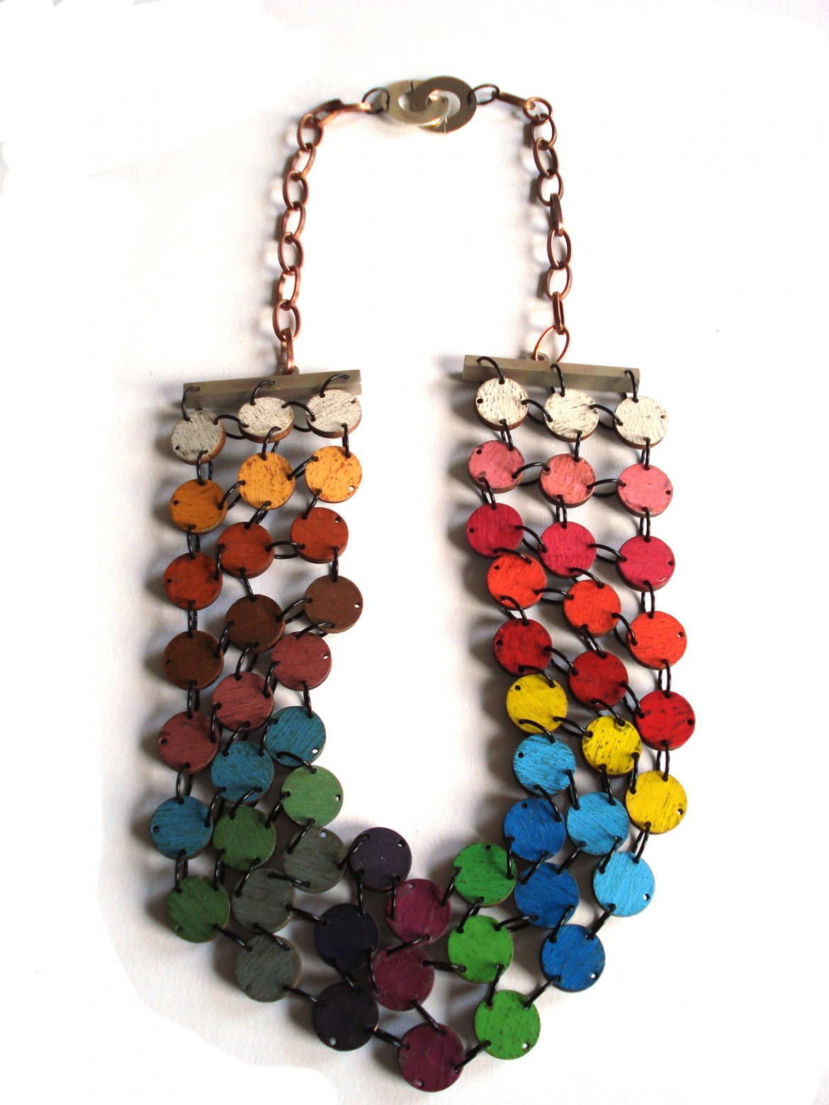 -hand painted laser cut wood, varnish, copper chain, black components, handmade silver spacers and clasp. -Unique piece, private collection. -2011