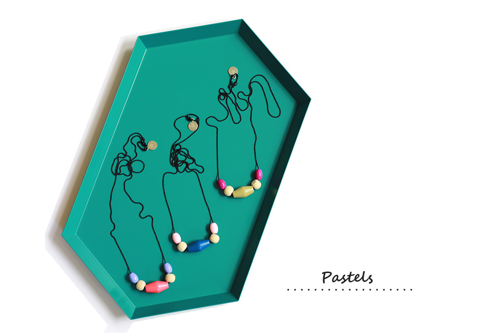 the new spring /summer 2016 colors have arrived! Enjoy the soft association of pastels tins of pinks, blues and khaki beads set on a little balls black chain for a graphic, cool & trendy necklace!