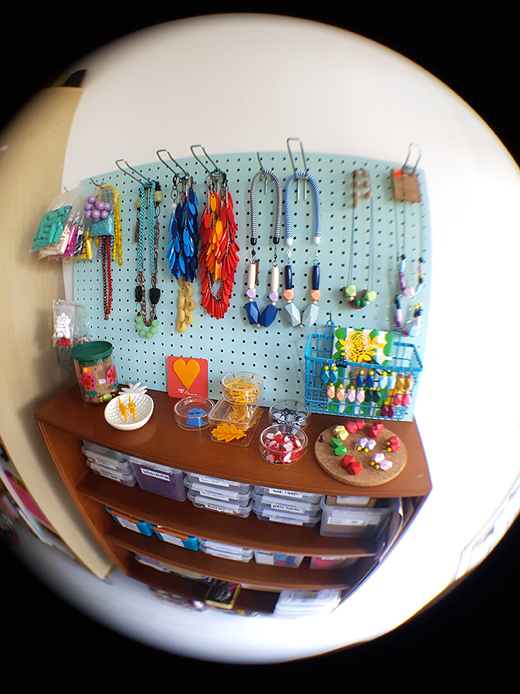 In my studio, I divided my space into different working areas, with a crafting desk, a computer desk ( that I share with my loved one) a custom made drawers cupboard and a presentation pegboard, on top of my currents collections, well organized in labeled boxes.