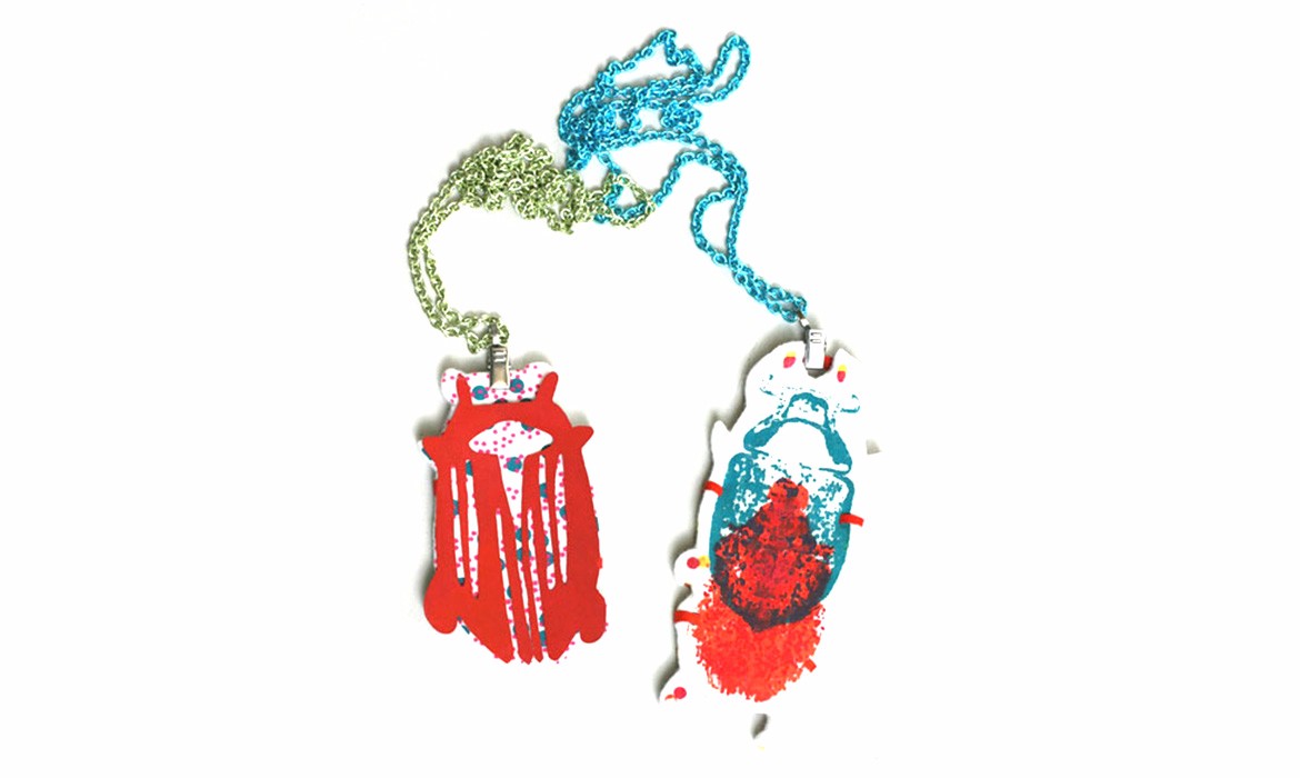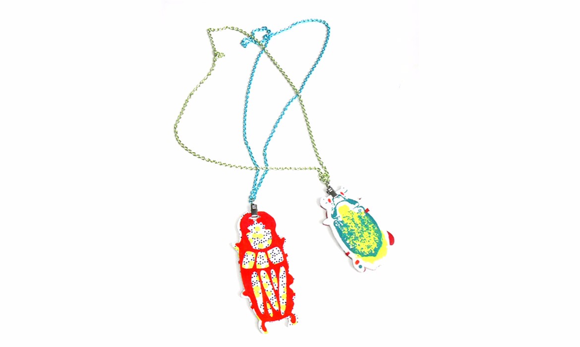 A touch of fauna in the botanical theme. During XVII century, floral composition paintings were a popular theme, were the bouquet evoked the transitional state of our life on earth. It associated the flower in its glory as well as the withered one with falling petals. If the butterflies and the dragonflies symbolised the soul, the lizard and the fly imaged death and rotting. These cool long beetles necklaces, that you would wear like a backstage pass to a concert, are a celebration to a fun young life.