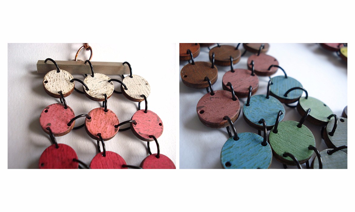 -hand painted laser cut wood, varnish, copper chain, black components, handmade silver spacers and clasp. -Unique piece, private collection. -2011