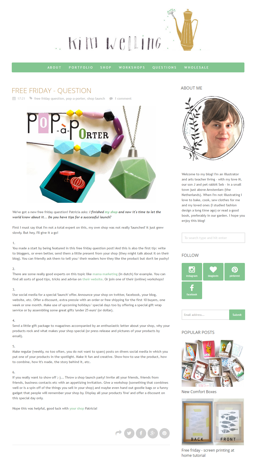 My question ‘I finished my shop and now it’s time to let the world know about it… Do you have tips for a successful launch?’ was selected for a ‘free- friday question’ post on Kim Welling’s blog.