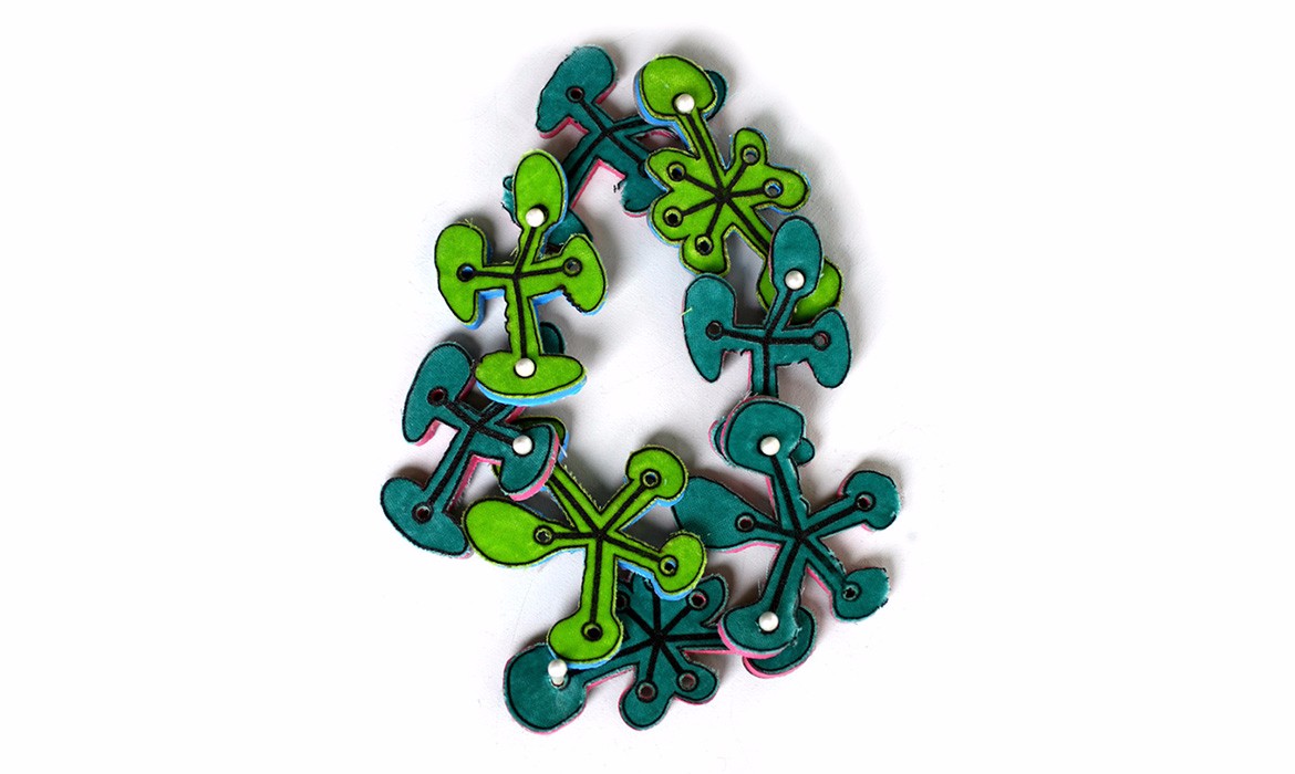 -Screen printed textile on colored silicon modules. Silver connectors. – Final exam work, unique piece, private collection. -july 2007.