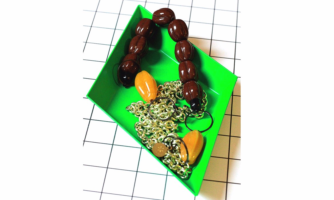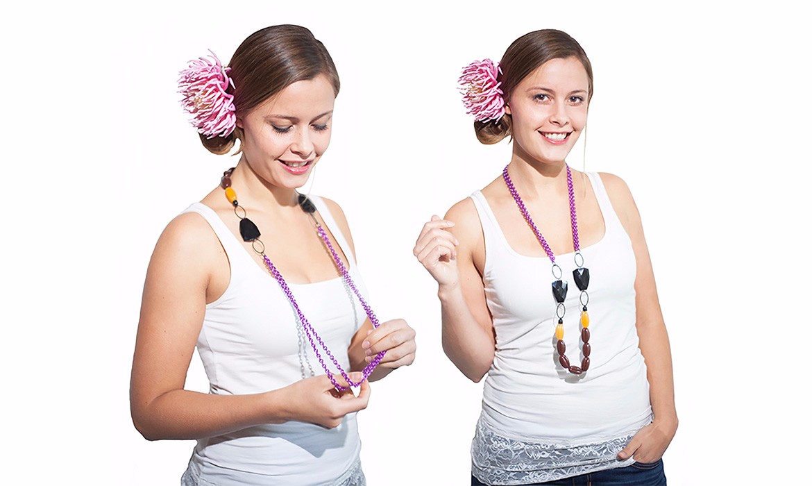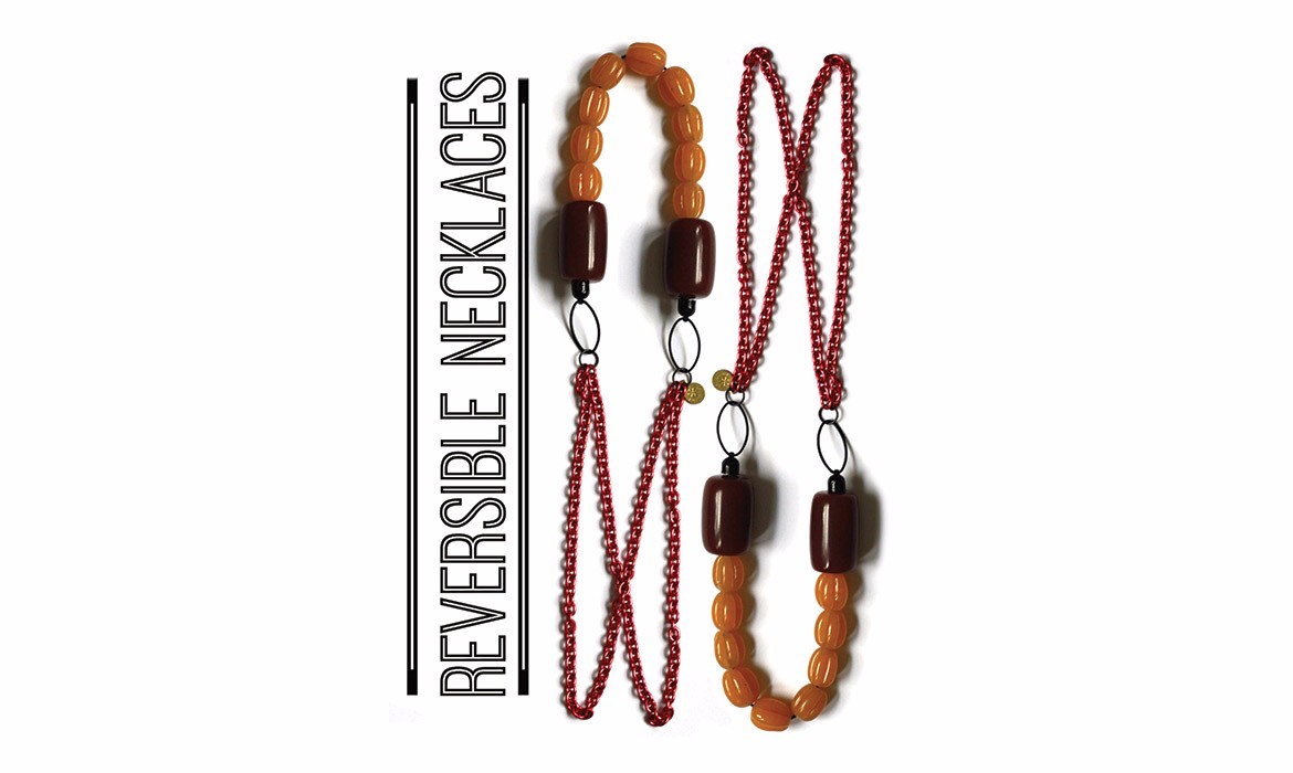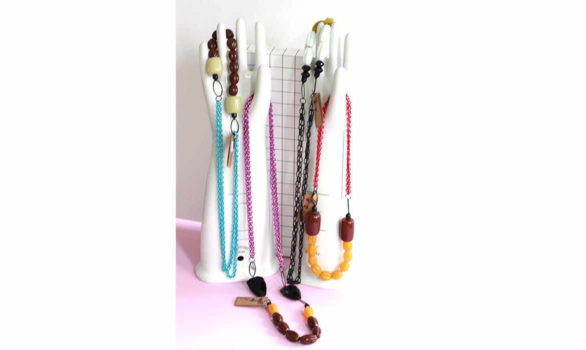 With theses graphic necklaces, colors and shapes are combined together to a pleasing way, letting the colors speak to each other. In this colorful collection, Patricia selected a various range of chains as well as beautiful resin or glas beads, for their graphical quality of shapes and colors in mind. With her selected materials, she compose the necklaces into fresh colorblock pieces. These abstract necklaces, have no up or down, making them playful piece of jewellery to accessorise an outfit.