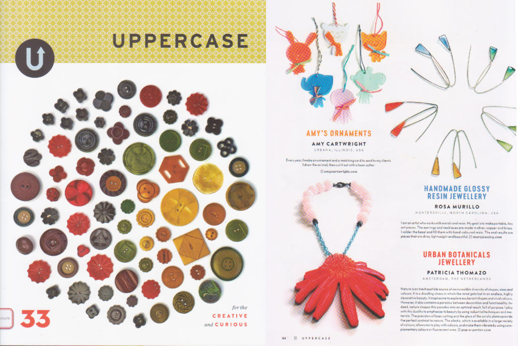 My ‘Cornflower ‘statement necklace is featured in the Uppercase magazine 33 from April / May / June 2017. This number is all about plastics & shininess, so I was thrilled to be featured! CA- April 2017.