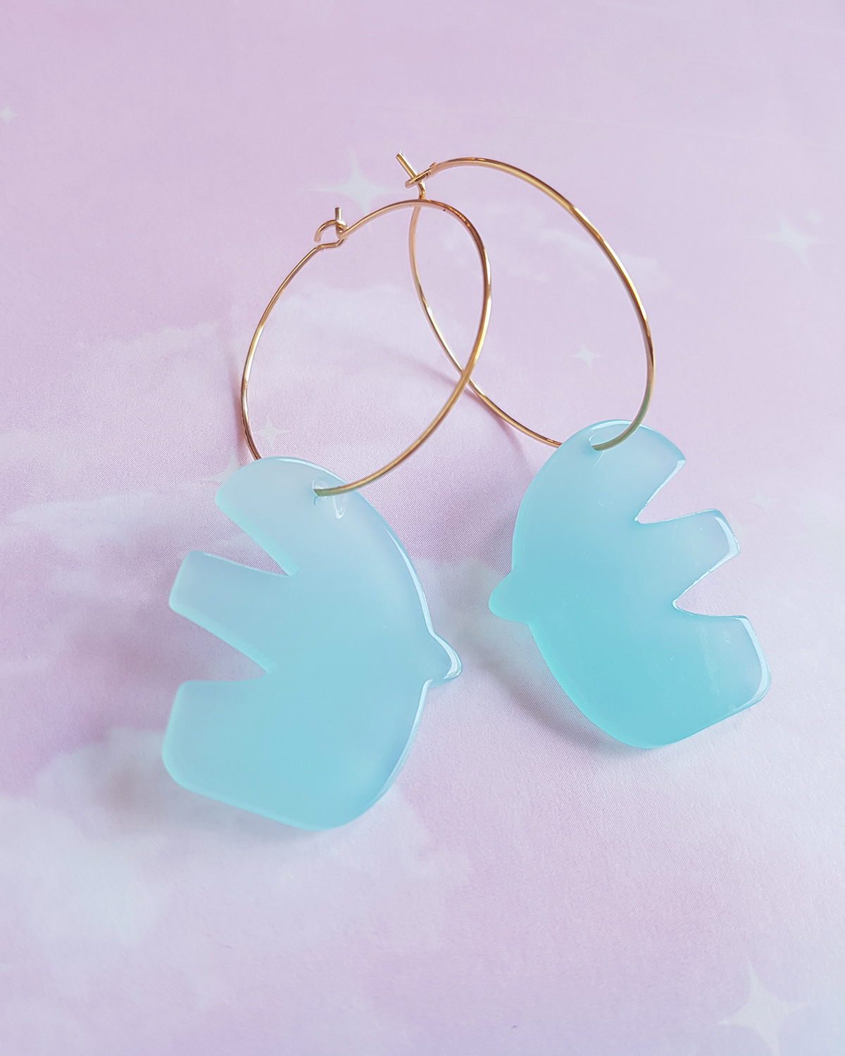 Mint blue acrylic bird pendant hanging on gold-plated Creole.