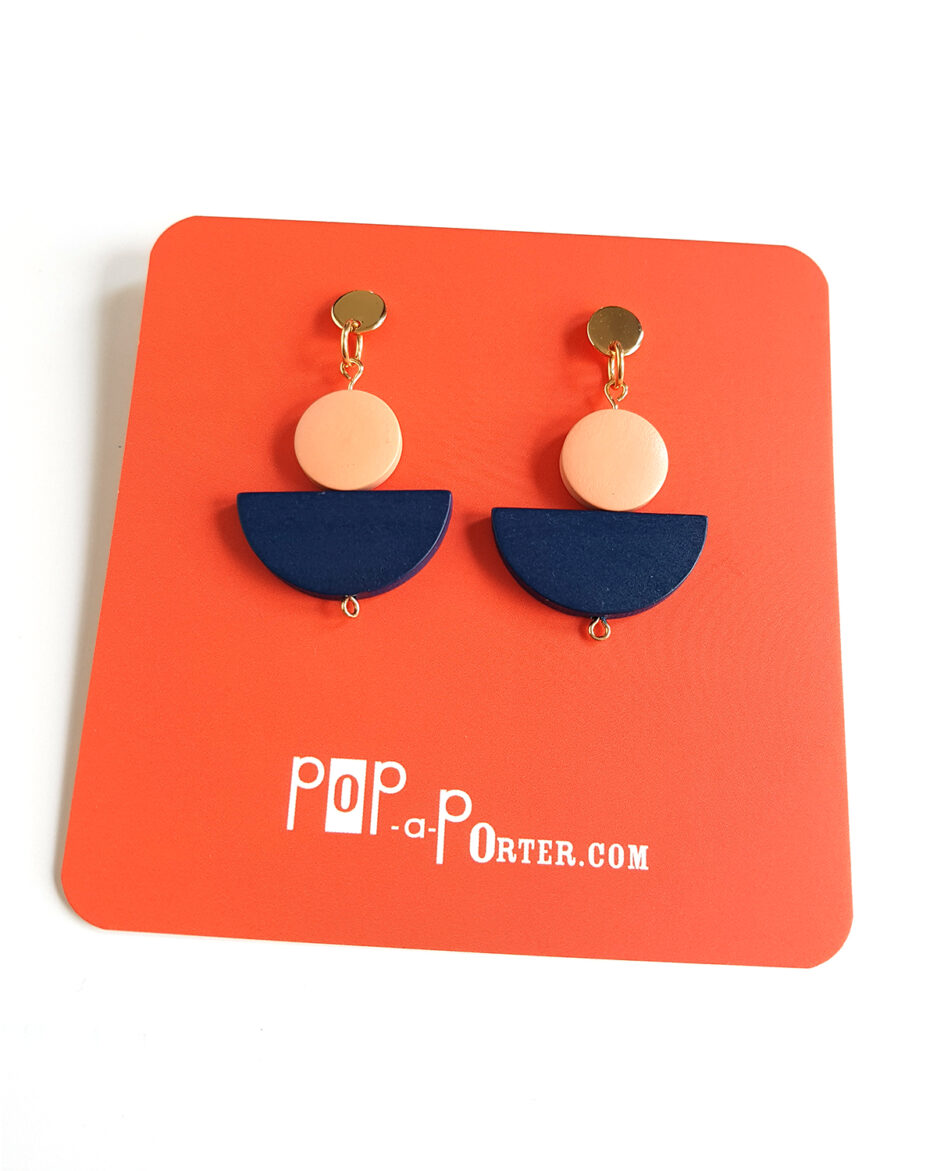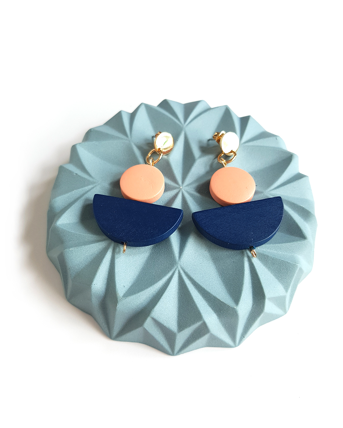 Wooden blue & peach pendant earrings set on golden ear studs.