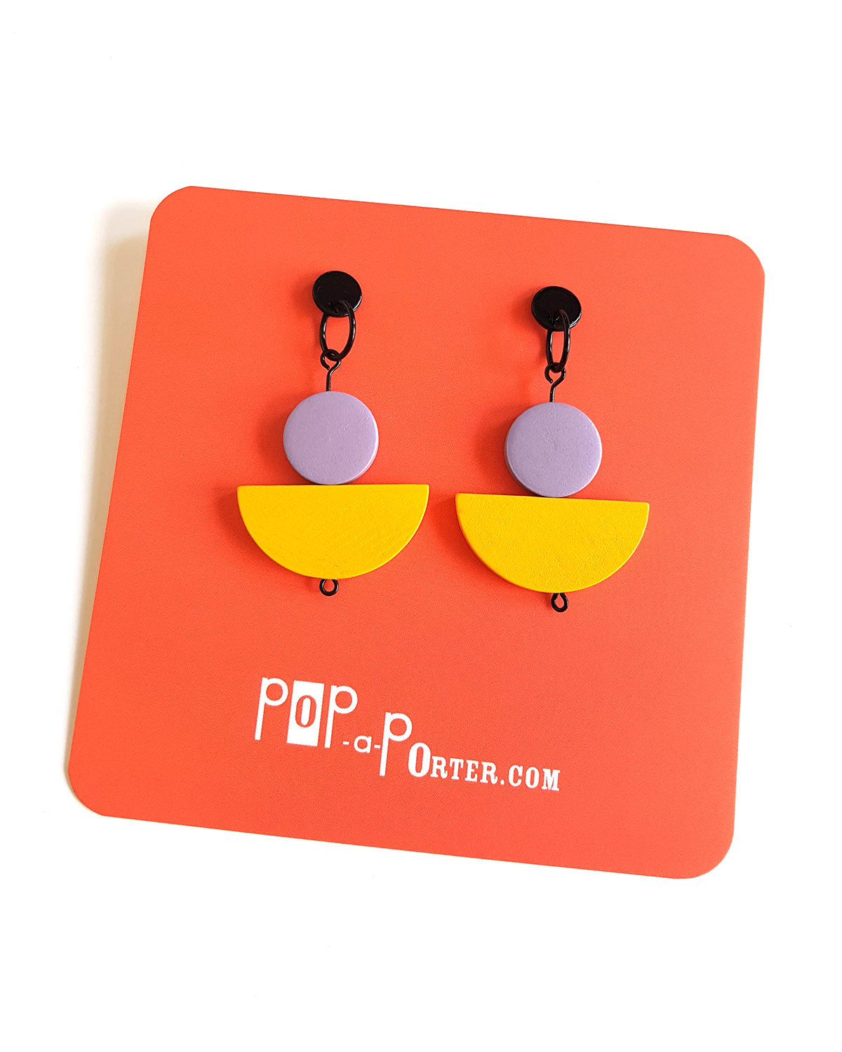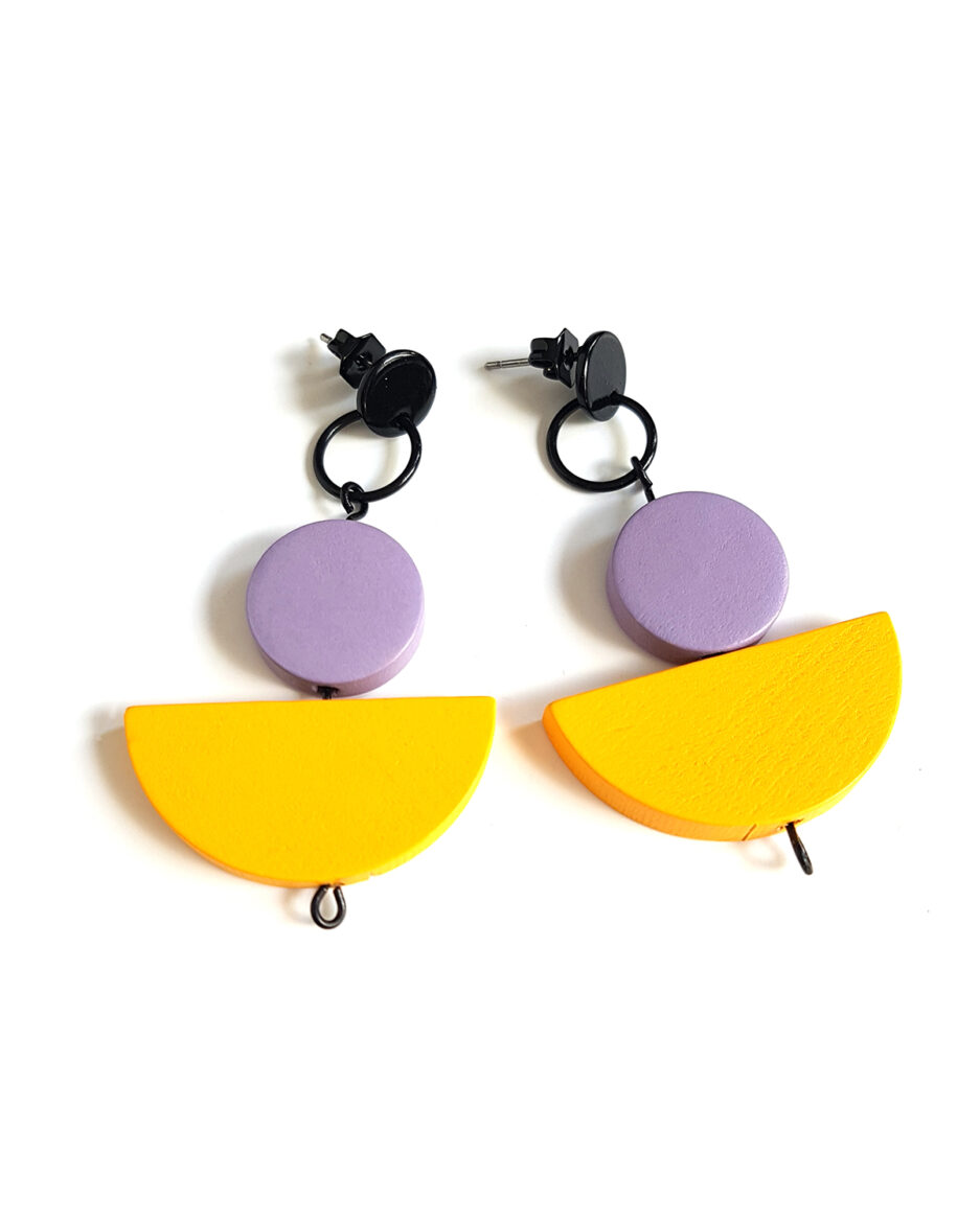 Wooden yellow & lilac pendant earrings set on black ear studs.