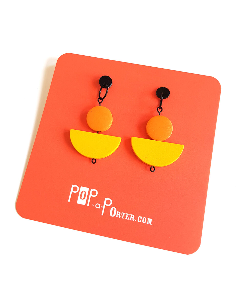 Wooden yellow & orange pendant earrings set on black ear studs.