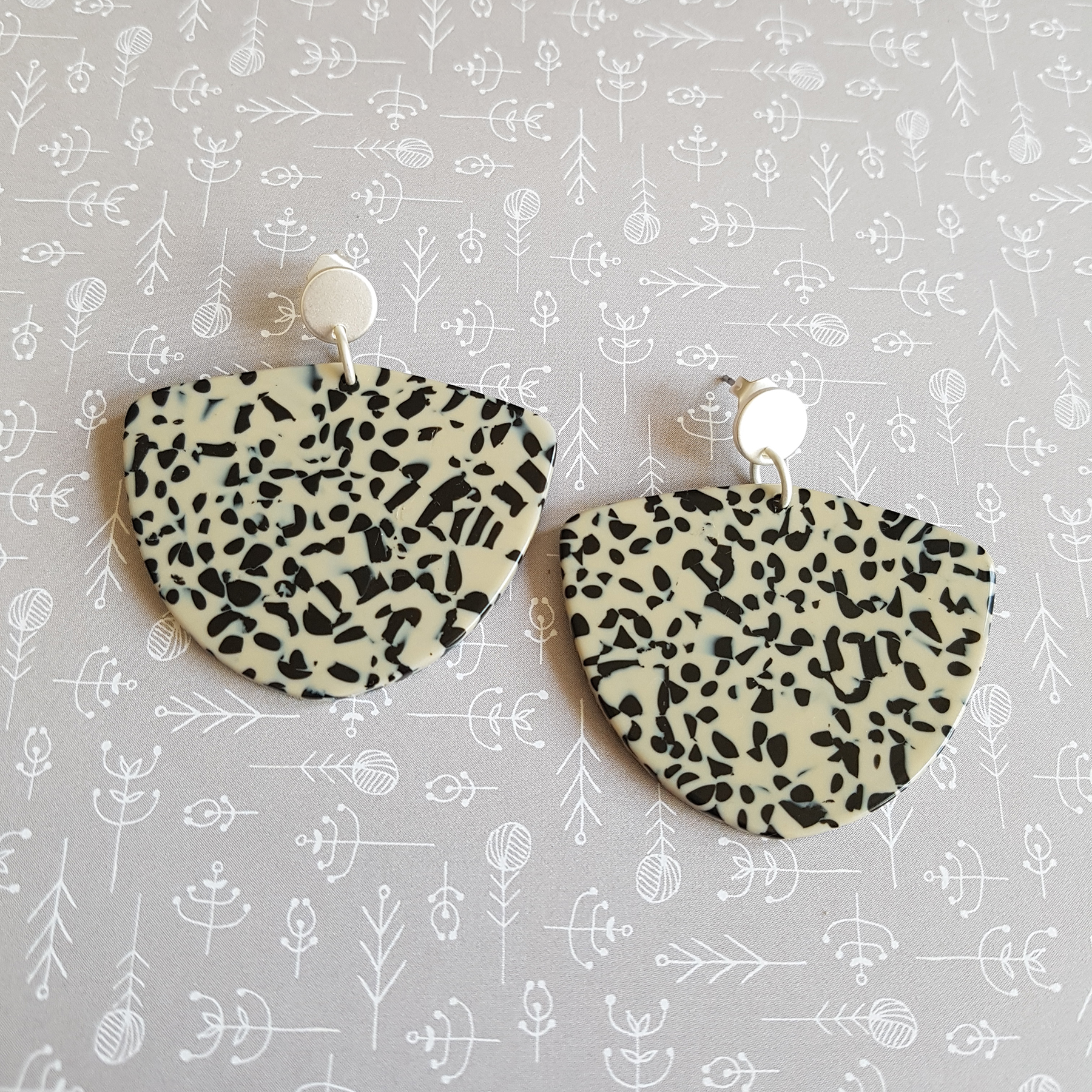 Spotted black geometrical acetate pendant earrings set on matt-silver ear studs.