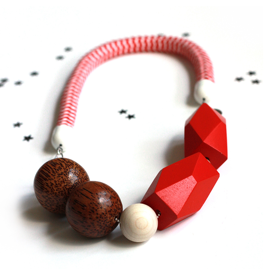 Made with carefully selected materials, this necklace features beautiful dark bamboo beads paired with big colorful hand-painted wooden beads as well as colorful aluminum rings to create a modern contrasting composition. The thick red & white chevron cotton rope adds the perfect touch of graphic boldness to the mix.