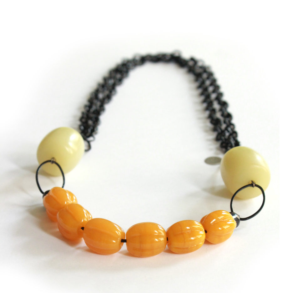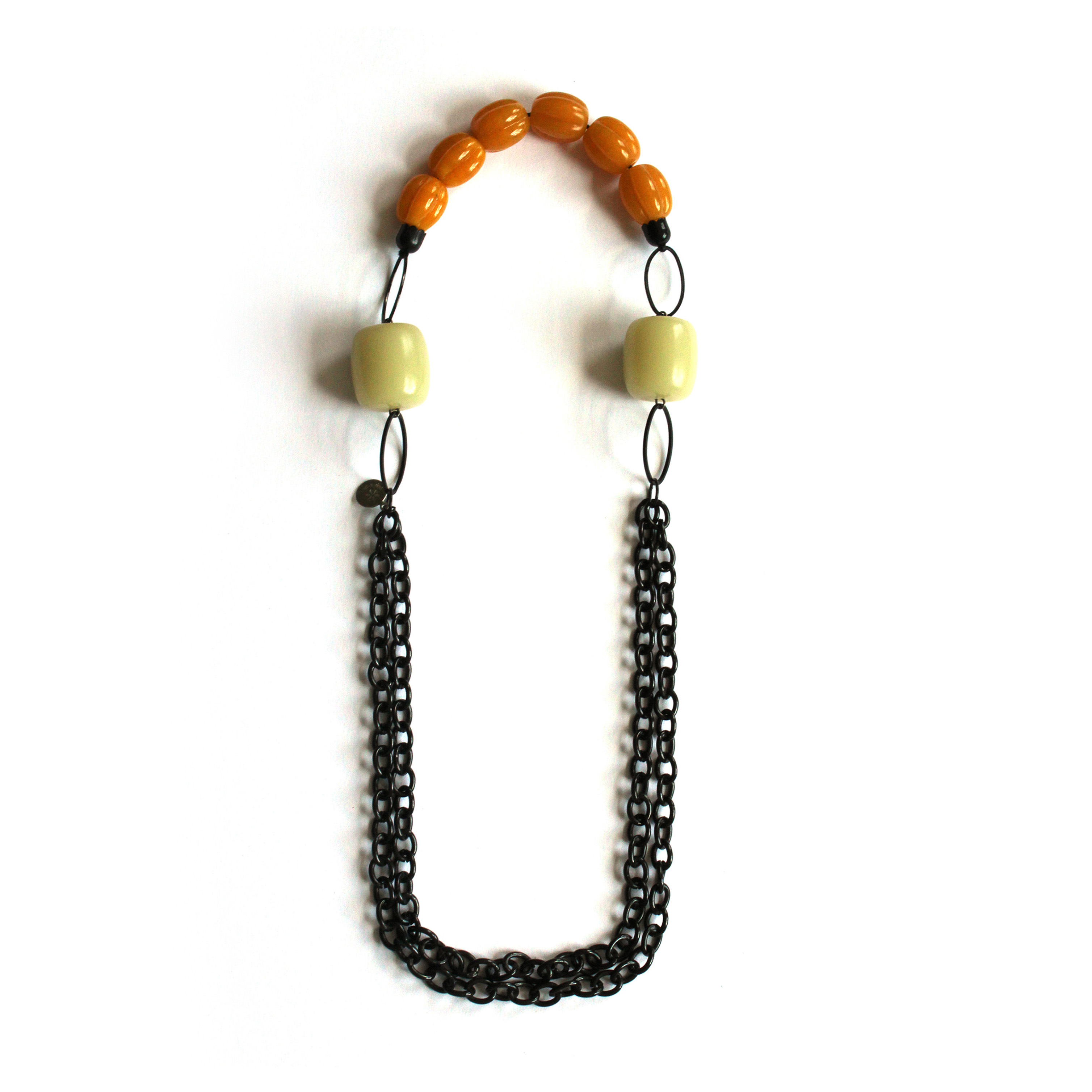 For this collection, I selected beautiful and authentic glass, resin and stone beads which are combined together with a colourful variations of metal chains. Subtly combine together with shiny black elements, adding the final graphical touch to a fresh & joyful colour combination. Perfect to rock any plain outfit.