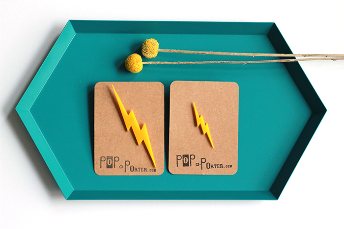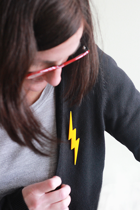 The brooch is made of a laser cut yellow Plexiglas®, with a silvered pull out pins. It is available in two sizes, small & big. Perfect to pin on your favorite jacket, vests, and sweater, it will bring a touch of originality and coolness to your outfit! This brooch is also unisex, being perfect for a trendy man gift!