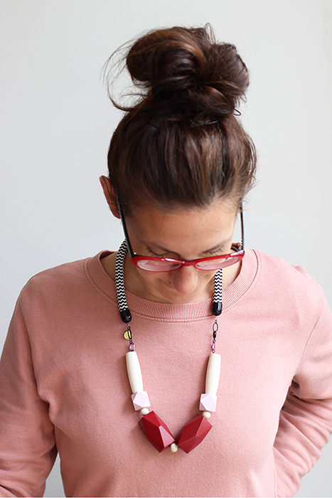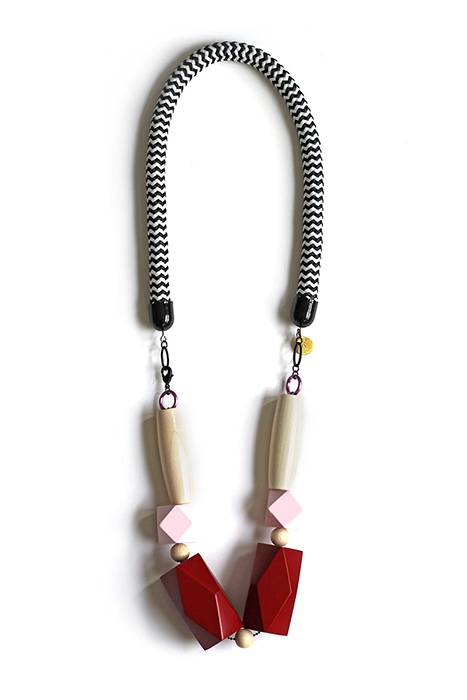 Made with carefully selected materials, this necklace features beautiful big hand-painted wooden beads with natural ones paired with colorful aluminum rings to create a modern contrasting composition. The thick Black & white chevron cotton rope adds the perfect touch of graphic boldness to the mix.