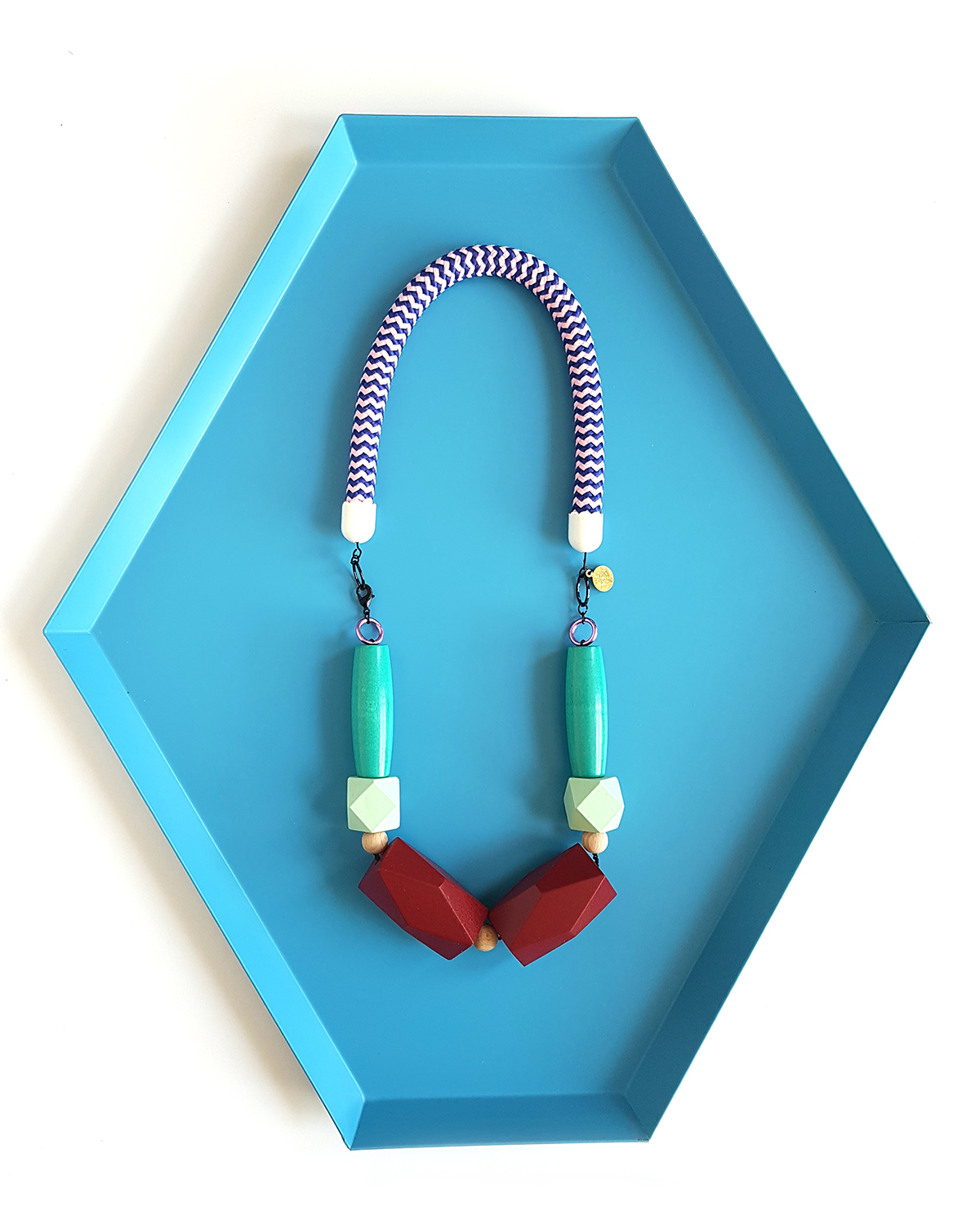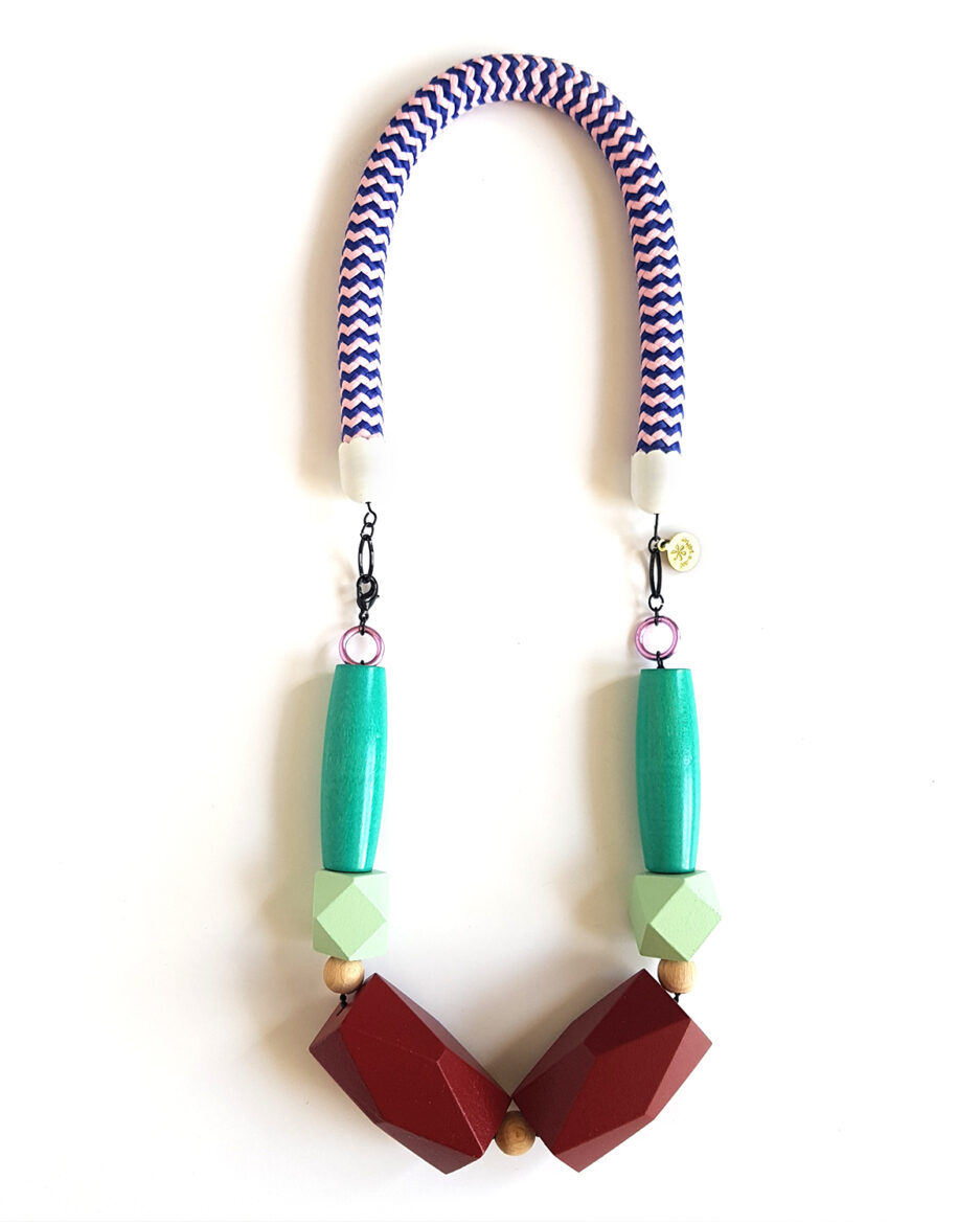 Made with carefully selected materials, this necklace features geometric chunky hand-painted wooden beads paired with long oval ones. Three small, natural, round beads are added to the mix for a visually pleasing, colorful composition.