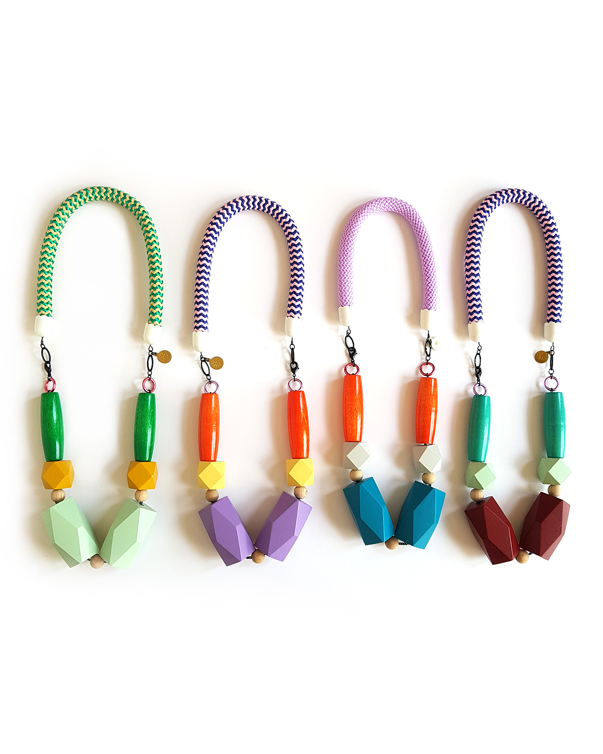 I use colorful aluminium rings to connect the beads to the 10 mm thick cotton rope that will be soft on your neck.