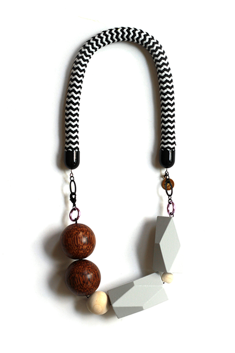 Made with carefully selected materials, this necklace features beautiful dark bamboo beads paired with big colorful hand painted wooden beads as well as colorful aluminum rings to create a modern contrasting composition. The thick Black & white chevron cotton rope add the perfect touch of graphic boldness to the mix.
