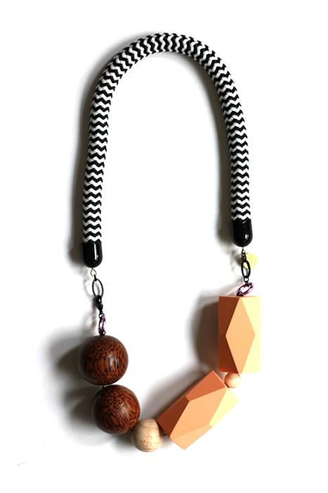 Made with carefully selected materials, this necklace features beautiful dark bamboo beads paired with big colorful hand painted wooden beads as well as colorful aluminum rings to create a modern contrasting composition. The thick Black & white chevron cotton rope add the perfect touch of graphic boldness to the mix.