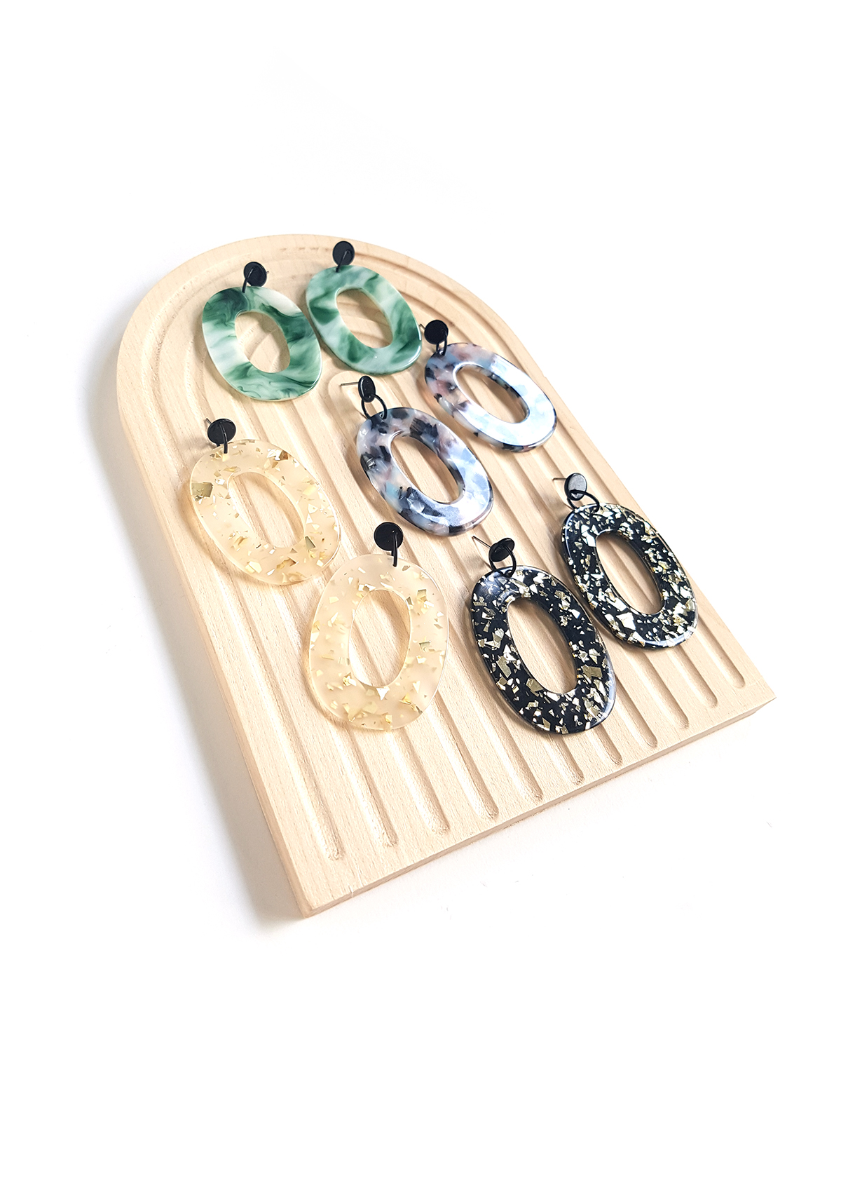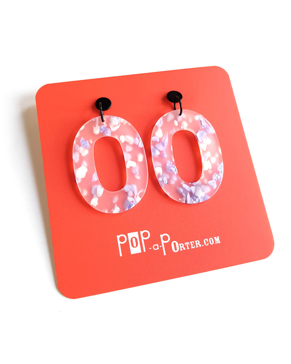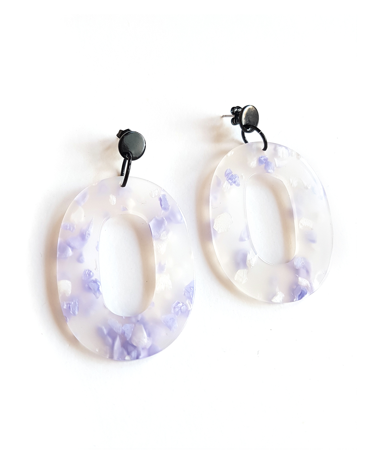 Purple Terrazzo oval resin pendant earrings set on black ear studs.