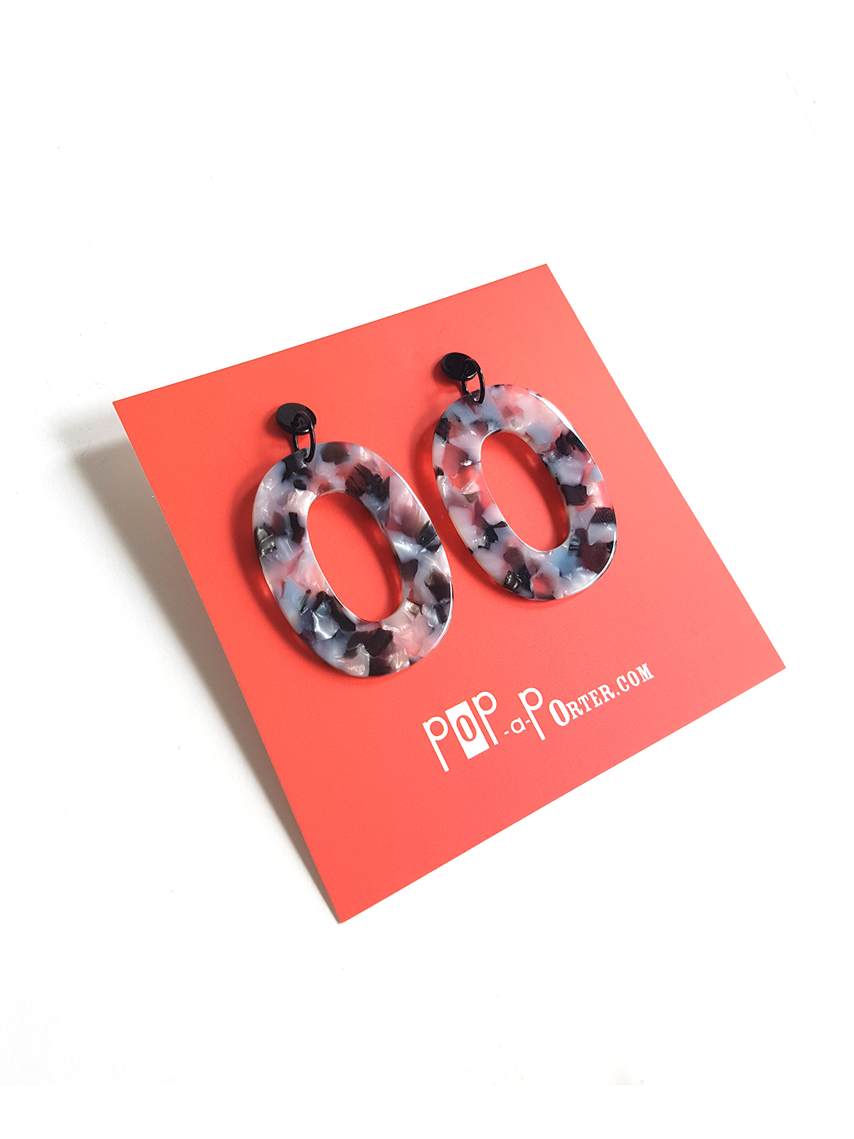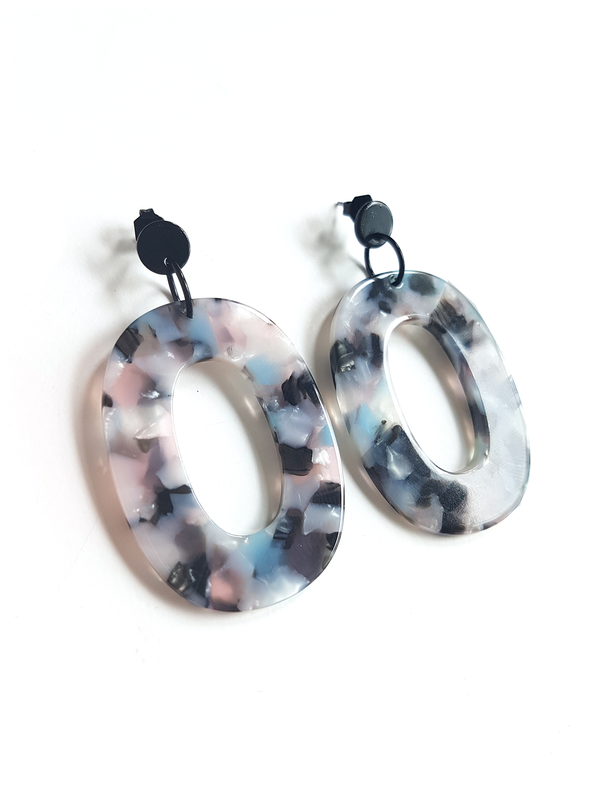 Tortoiseshell-inspired oval resin pendant earrings set on black ear studs.